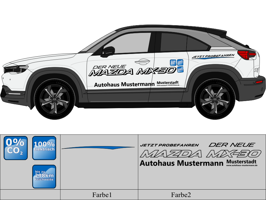 Die von uns verwendete Folie ist eine weiche PVC Folie für kurz bis mittelfristige Beschriftungen auf glatten und ebenen Untergründen ( ca. 2-4 Jahre)