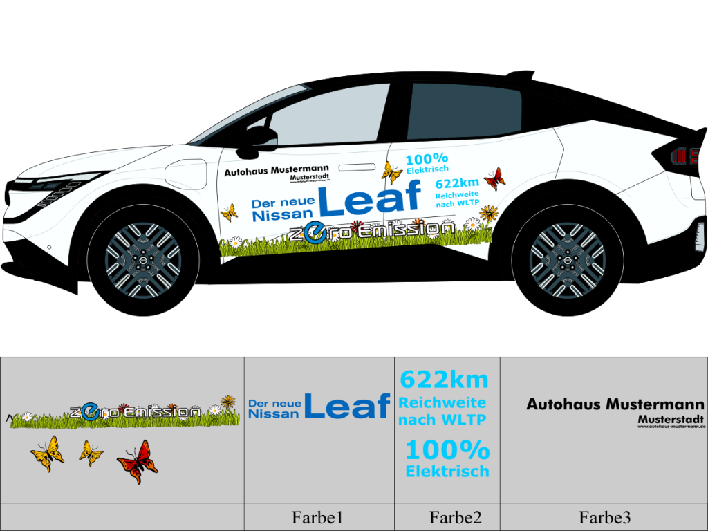 Die von uns verwendete Folie ist eine weiche PVC Folie für kurz bis mittelfristige Beschriftungen auf glatten und ebenen Untergründen ( ca. 2-4 Jahre)